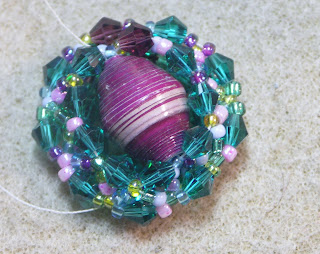 In addition to beading the entire background in various shades of white and crystal beads, my original thought was to use the beaded buttons I made and stack them like a snowman, but they were too large and over powered my tree. I made up the smaller sized buttons and the outcome was just downright scary (Nightmare before Christmas, anyone???)